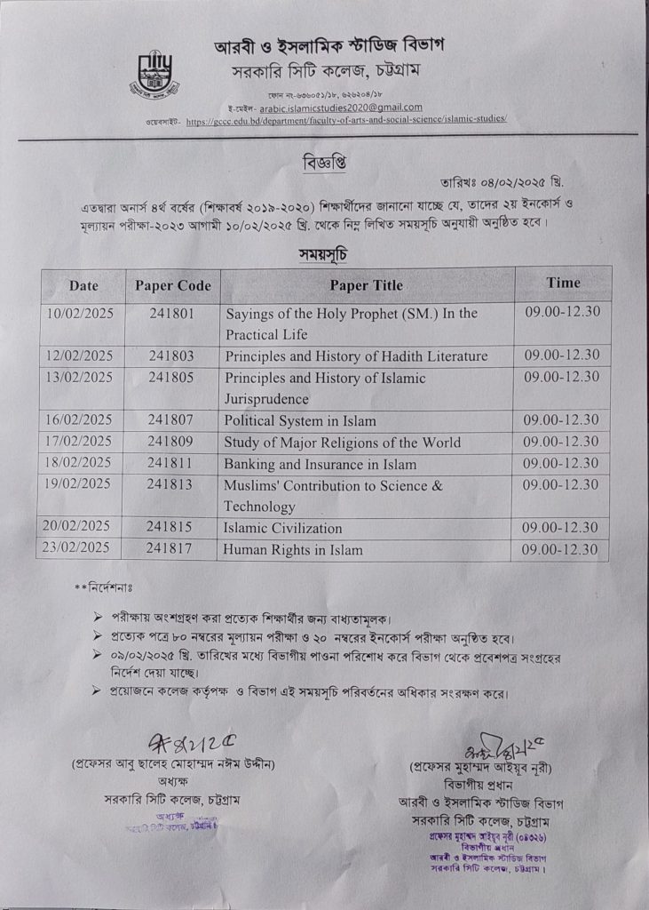 অনার্স ৪র্থ বর্ষ ২য় ইনকোর্স ও মূল্যায়ন পরীক্ষা-২০২৩ এর সময়সূচি